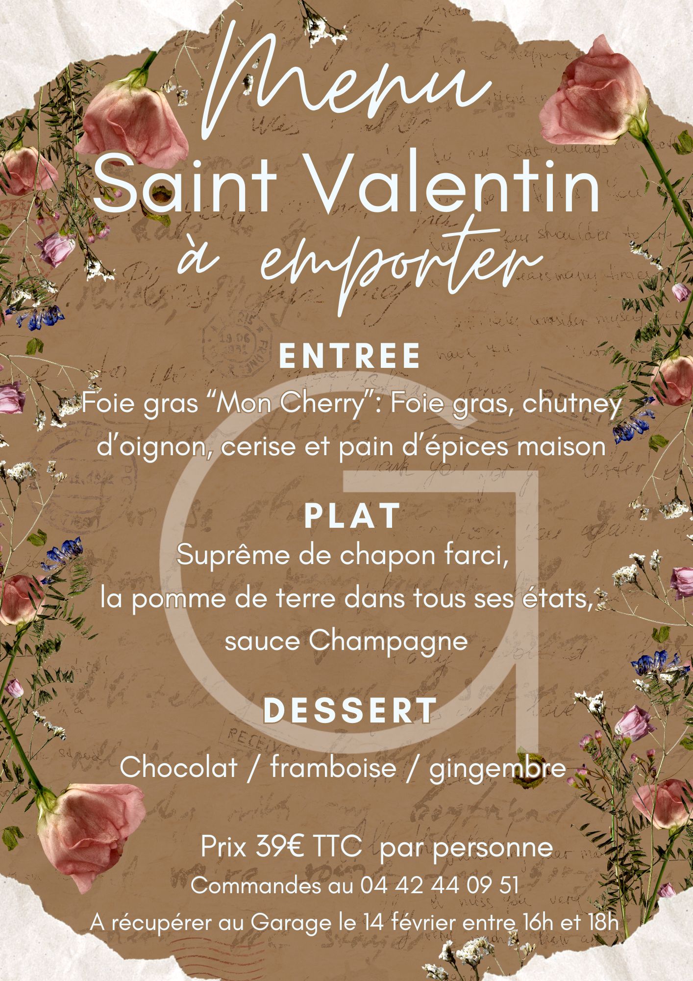 Si vous n'êtes pas du genre à aller au restaurant le soir de la Saint Valentin et que vous préférez les soirées plus cosy et intimiste, le Garage vous propose un menu Saint Valentin à emporter. Vous pourrez donc impressioner votre partenaire avec un menu gastronomique à seulement 39€. Il ne vous restera plus qu'à profiter de votre soirée en amoureux sans passer des heures en cuisine Télécharger le menu